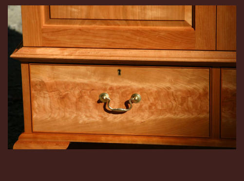 Base of cabinet showing the drawer with crotch cherry