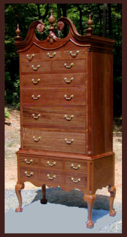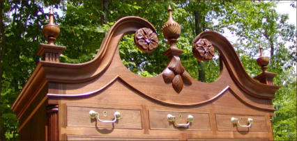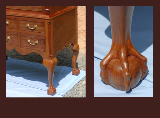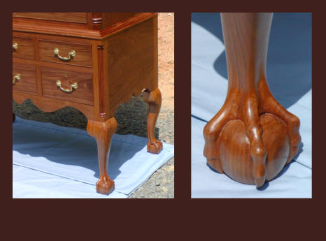 Ball and claw feet, quarter columns, carvings, hand cut dovetails, gooseneck molding, rosettes and turned finials.