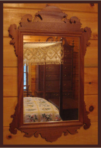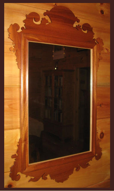 Sack. The mirror frame and scrolled border are made from solid mahogany with a maple stringing band around