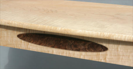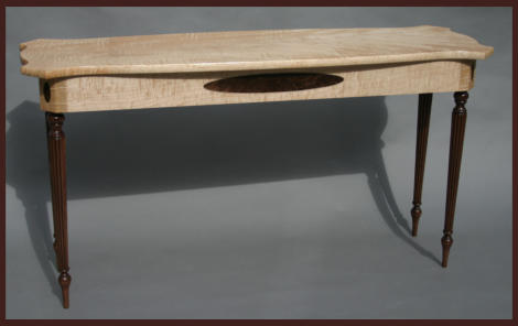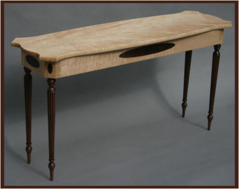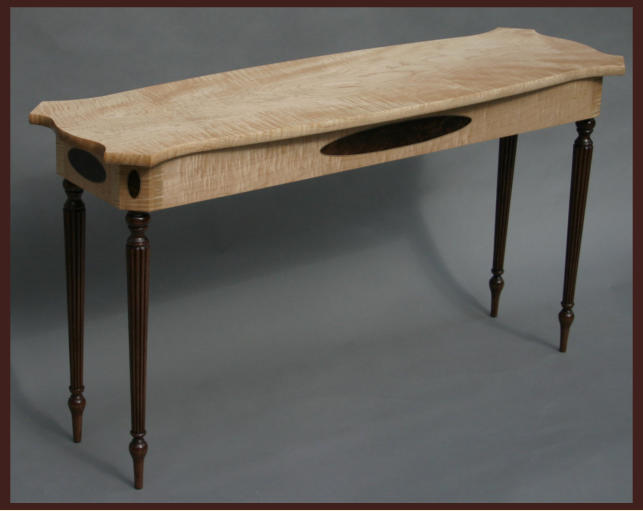 The sofa or hall table shown below was constructed in a Federal style from solid tiger maple and black walnut -