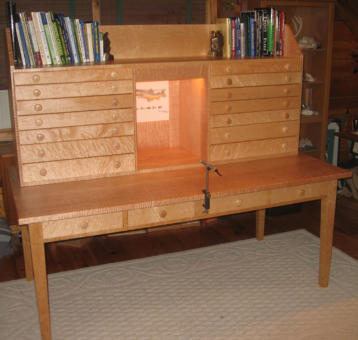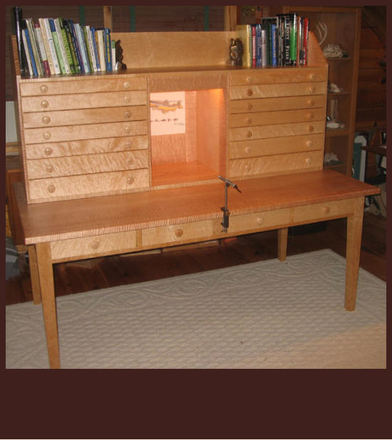 overhead bookshelf. The desk is constructed from solid curly maple with birdseye maple drawer fronts. There