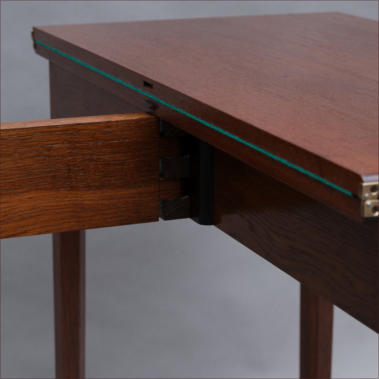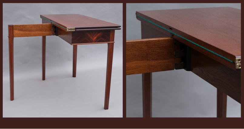 features a rear fly leg which swings open to support the top. The interior of the top is covered with green baize to