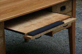 additional writing surface. A computer keyboard and mouse tray are hidden within the center drawer