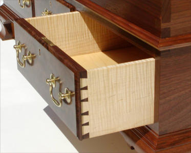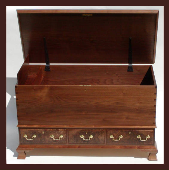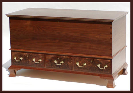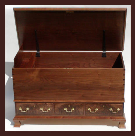 made from a matched set of walnut crotch boards with curly maple sides and backs. The main chest and drawers