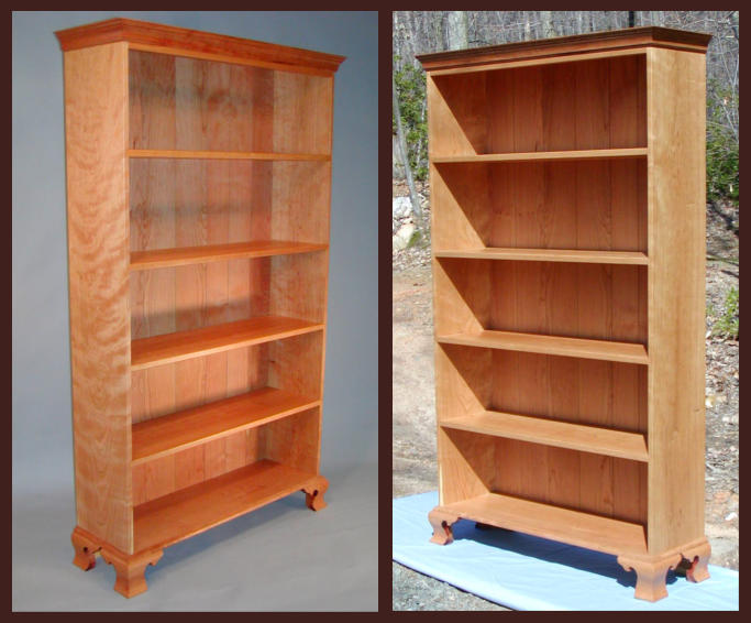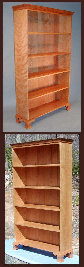 This Queen Anne style bookcase was built from solid curly cherry and features ogee bracket feet and one piece
