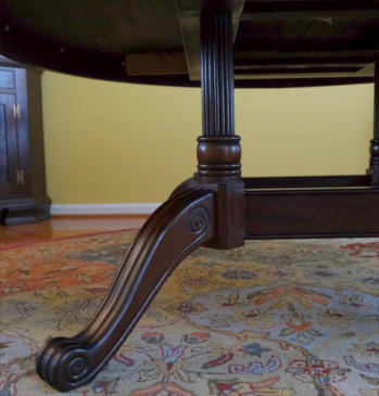 with fluting and scrolled legs with a carved foot scroll. The table features a reproduction wooden extension
