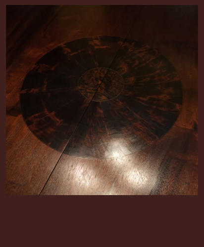 curve of the table top. In the center of the table top, an 18" diameter sunburst pattern is inlayed with a burl center