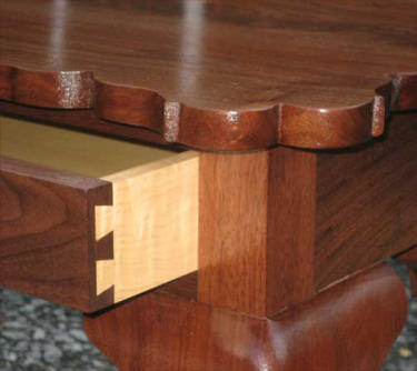 Detail views of the inset drawer and single board crotch walnut top.