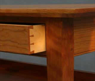 table features three drawers with handcut dovetail joinery and traditional shaker style cherry pulls. The