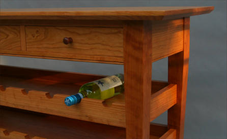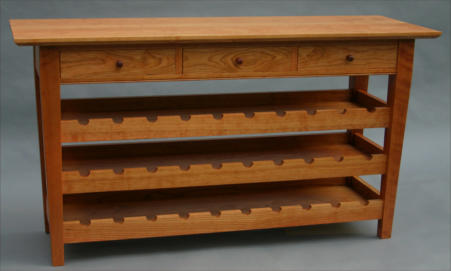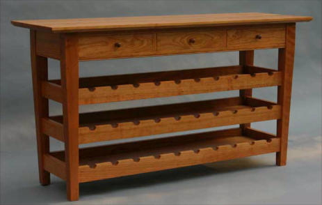 storage shelves to hold 30 bottles of wine. The table is constructed from a matched set of wide cherry with overall