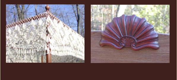 Detail view of canopy frame and carved shell on headboard.